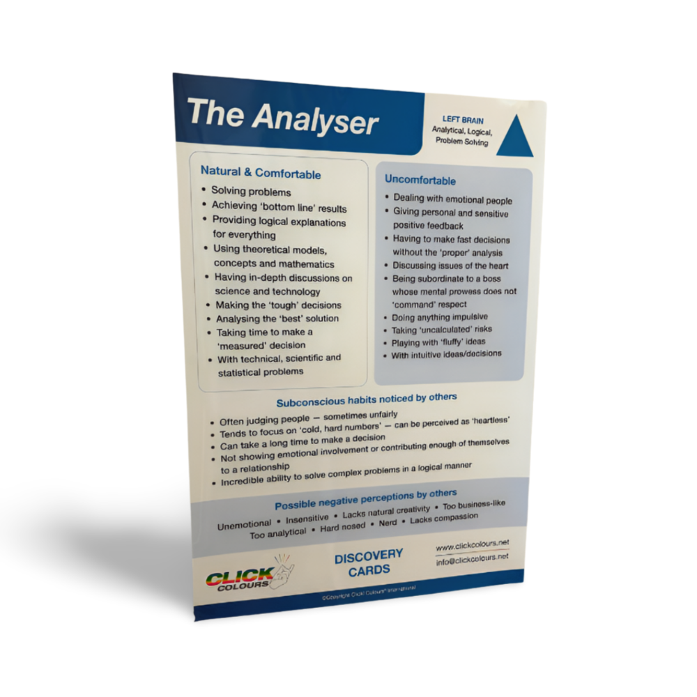 The Click! Colours Discovery Cards represent the next generation of personality tools and offer a better, faster, cheaper and easier way to help people and teams understand and value diversity in their organisations.