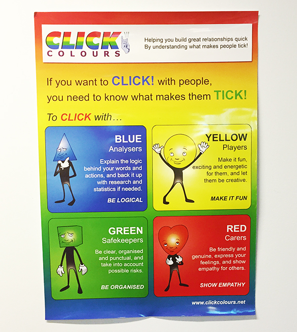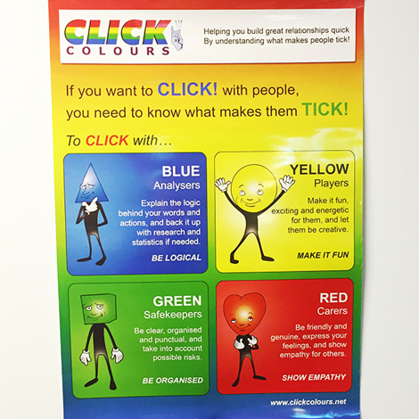 Make the Click! Colours live on in your workplace place with colourful Click! Colours posters that will remind your people that to build great relationships quick, you need to understand what makes people tick!